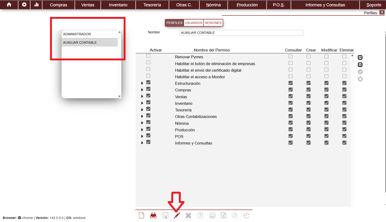 ✅ Escoge el perfil al cual deseas asignarle los permisos, clic en lápiz "editar":