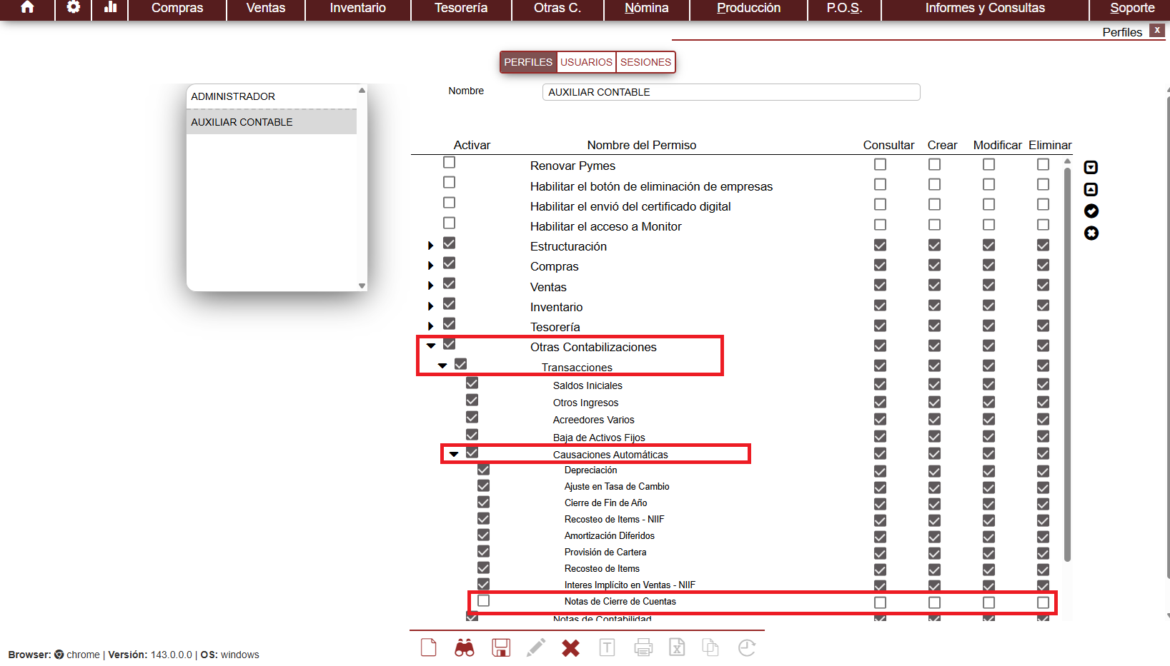 ✅Selecciona los botones: Otras contabilizaciones - Transacciones - Causaciones automáticas y asigna los permisos para notas de cierre de cuentas: