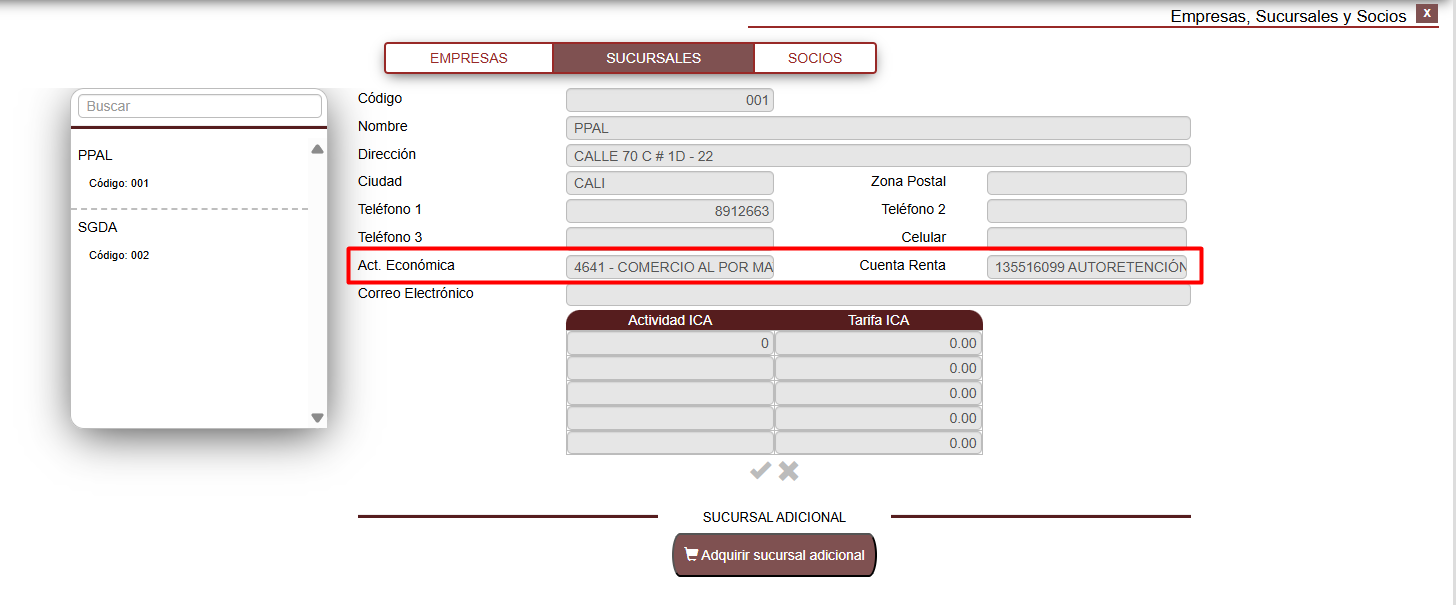 - Pasa a la pestaña 'SUCURSALES' , elige tu sucursal principal y verifica las casillas actividad económica y automáticamente va tomar la cuenta PUC 135516099, así: